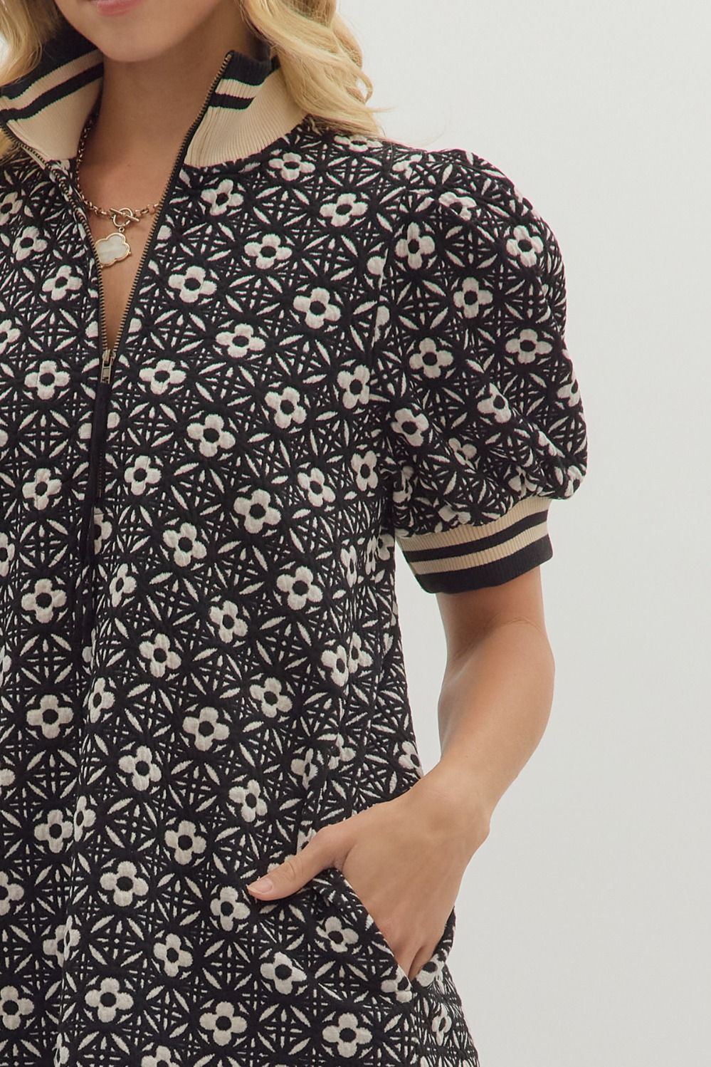 Floral textured short puff sleeve mini dress featuring half zip closure at front. Ribbed collar and cuffs.