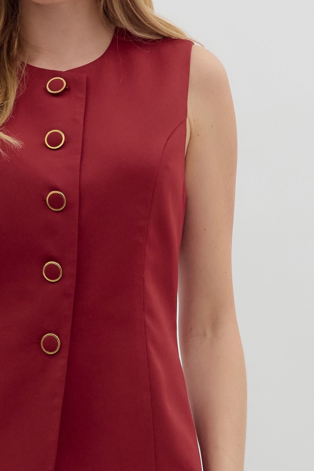 Solid sleeveless round neck playsuit featuring gold rim accent button closure and concealed side zipper. Lined.