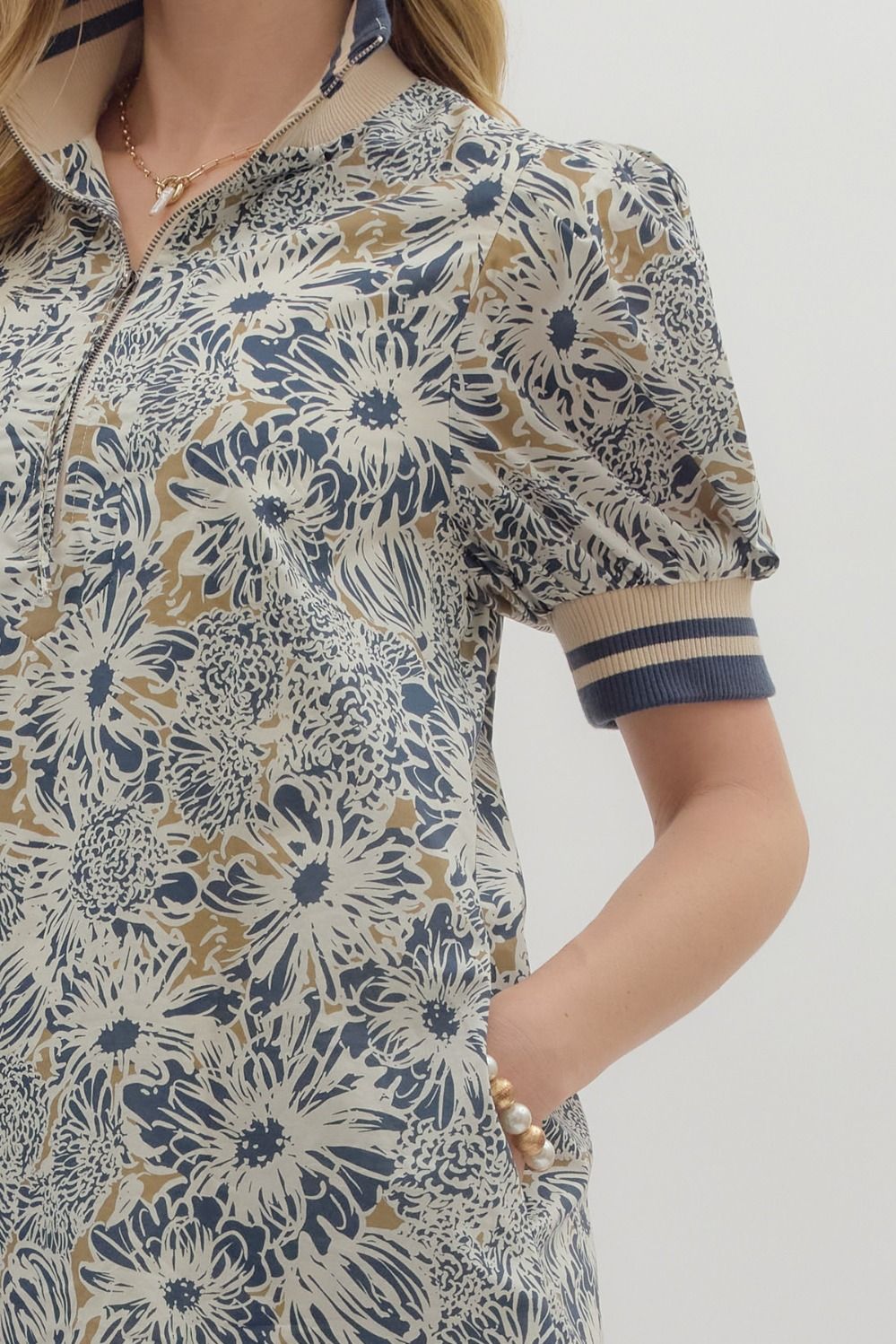 Floral print short puff mini dress with front zipper and multicolor ribbed trim. Side pockets.