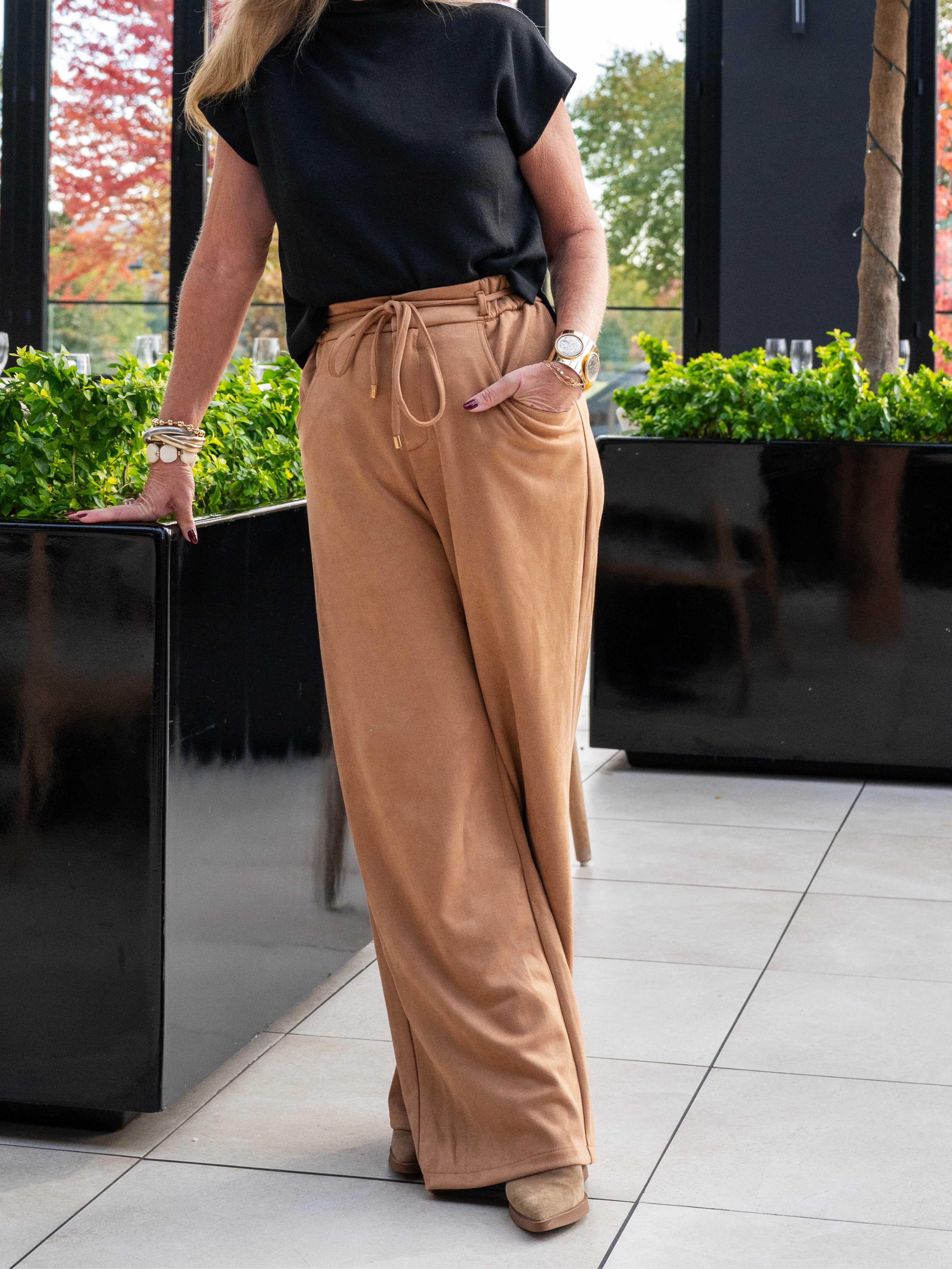 • Solid faux suede wide leg pants featuring elastic waistband with self-tie drawstring.