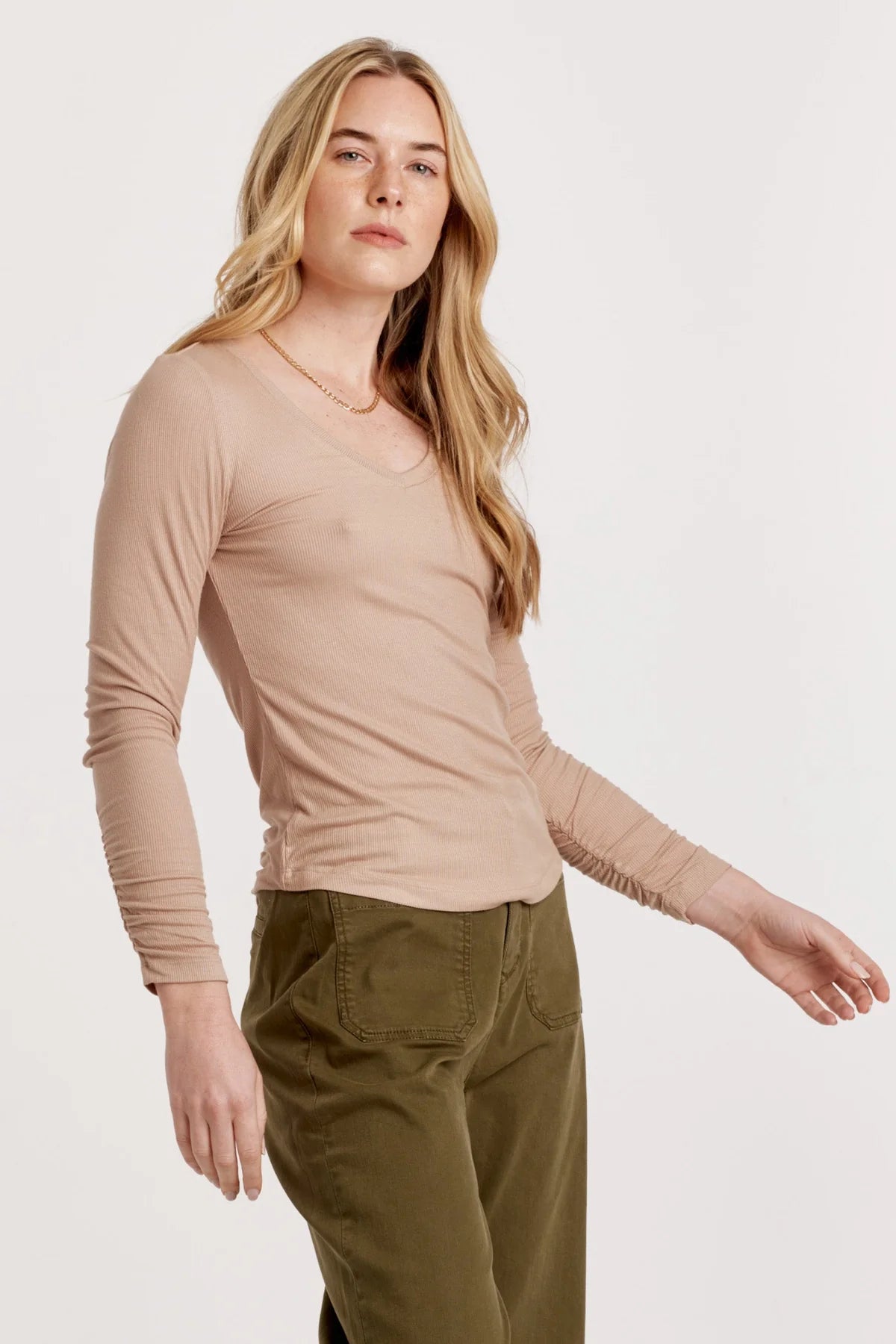 Long sleeve tee with v-neck finish. The perfect tee, ready pairing for any lifestyle, the "look" for any occasion. Solid color knit fitted.