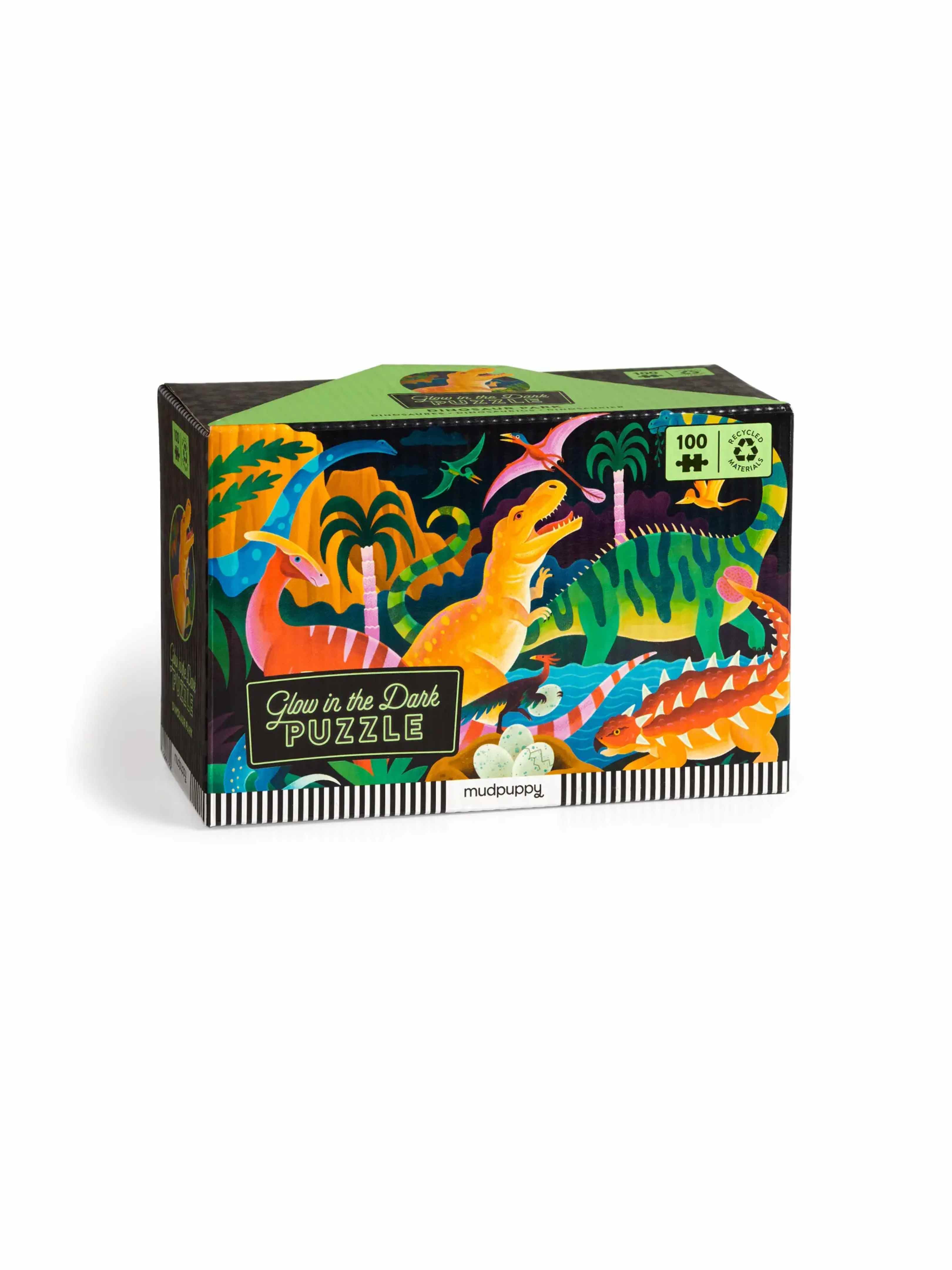 Our 100 piece Dinosaur Park Glow In The Dark puzzle features a prehistoric image of dragons roaming about. After the puzzle is pieced together, turn out the lights to reveal a glow in the dark surprise, the dinosaurs' skeletons are revealed! This puzzle is just the right level of challenge for children ages 5 and up! The box includes an insert with the full puzzle image for reference.