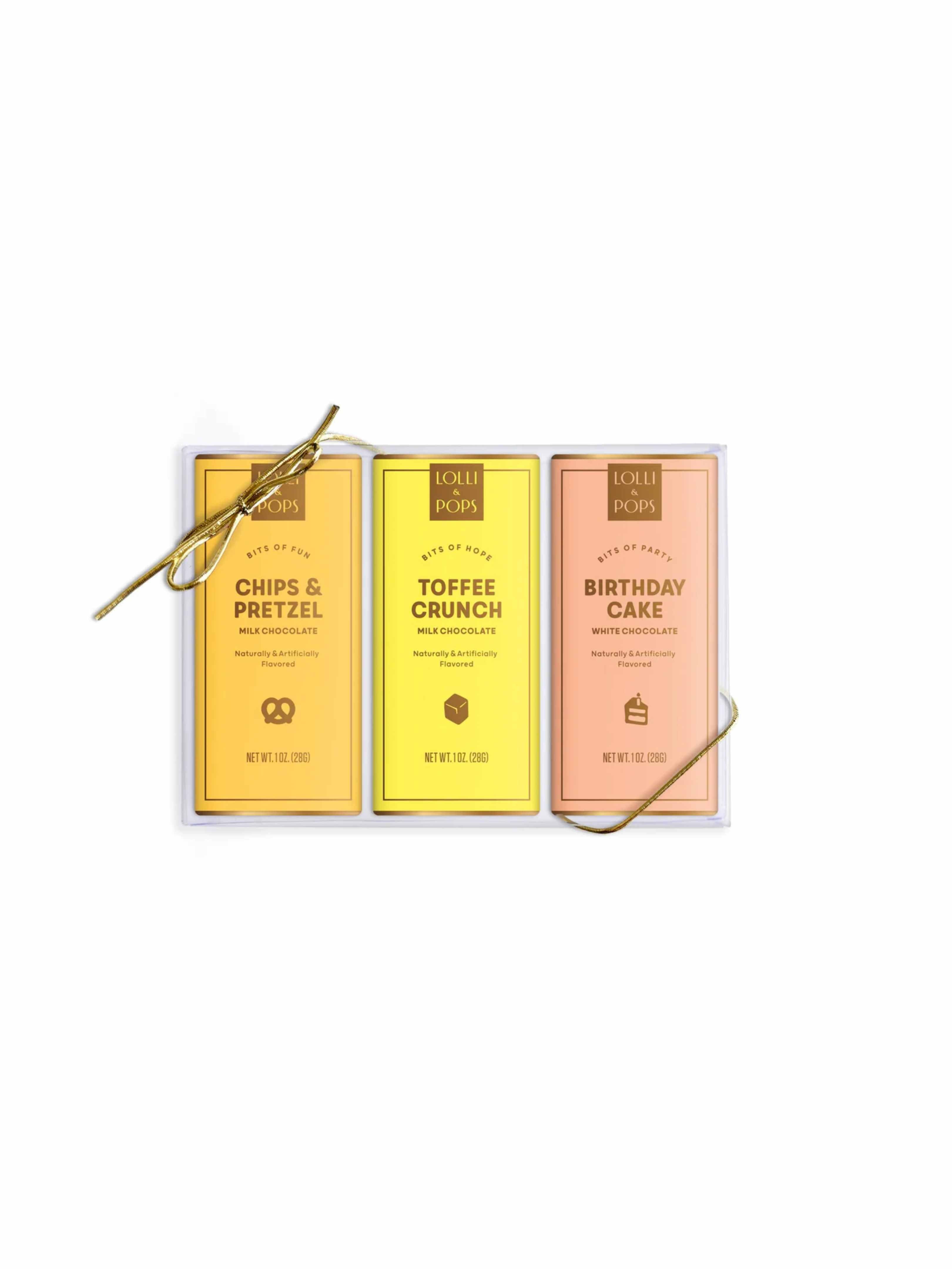 Enjoy a bit everything with this collection of favorite flavored chocolate bars including White Chocolate Birthday Cake, Milk Chocolate Chips and Pretzels, and Milk Chocolate Toffee Crunch.