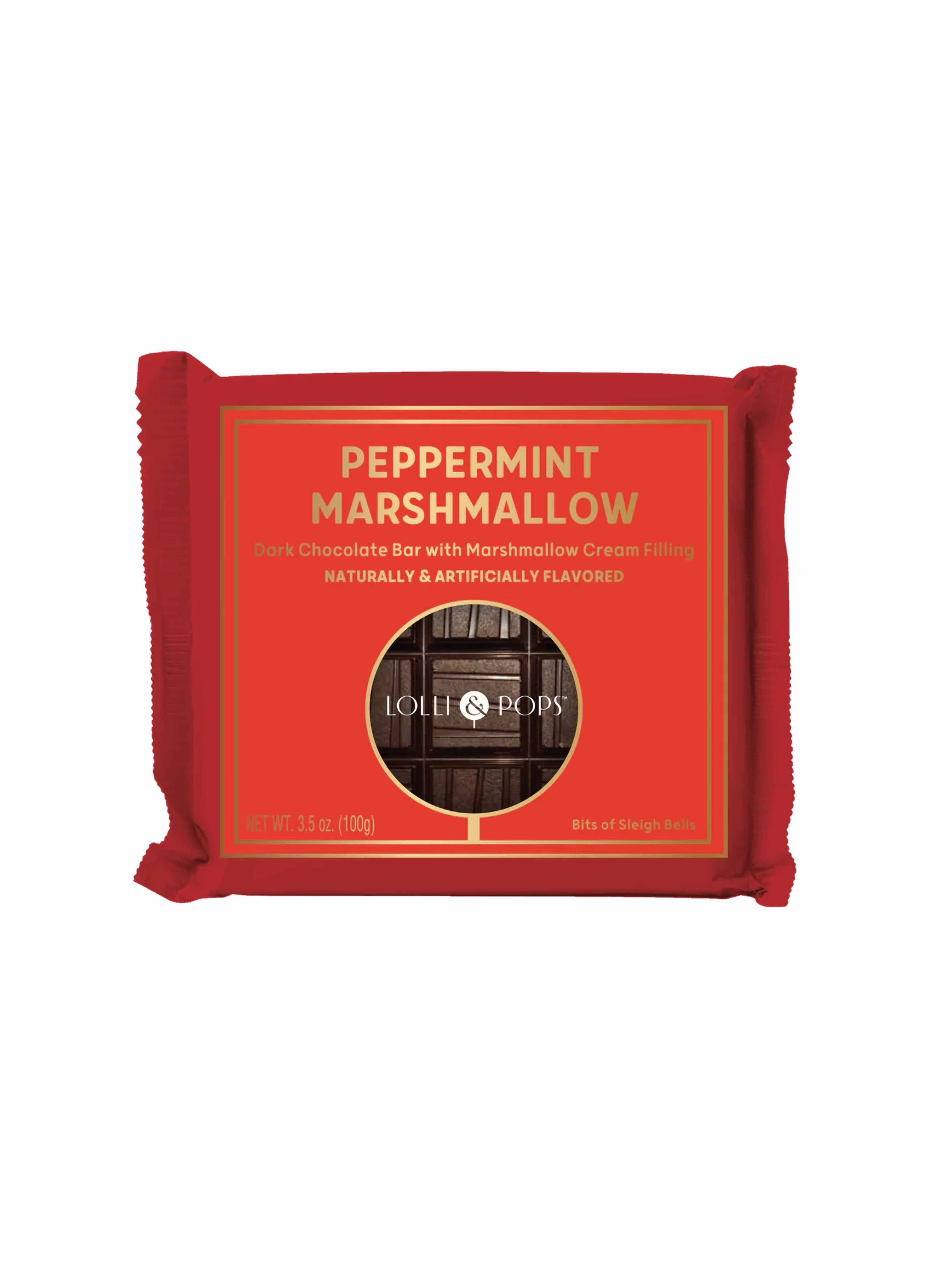 Lolli & Pops Peppermint Marshmallow Chocolate Bar is made of premium Belgian dark chocolate and filled with a gooey marshmallow-y filling with festive peppermint flavors. A decadent and refreshing treat!