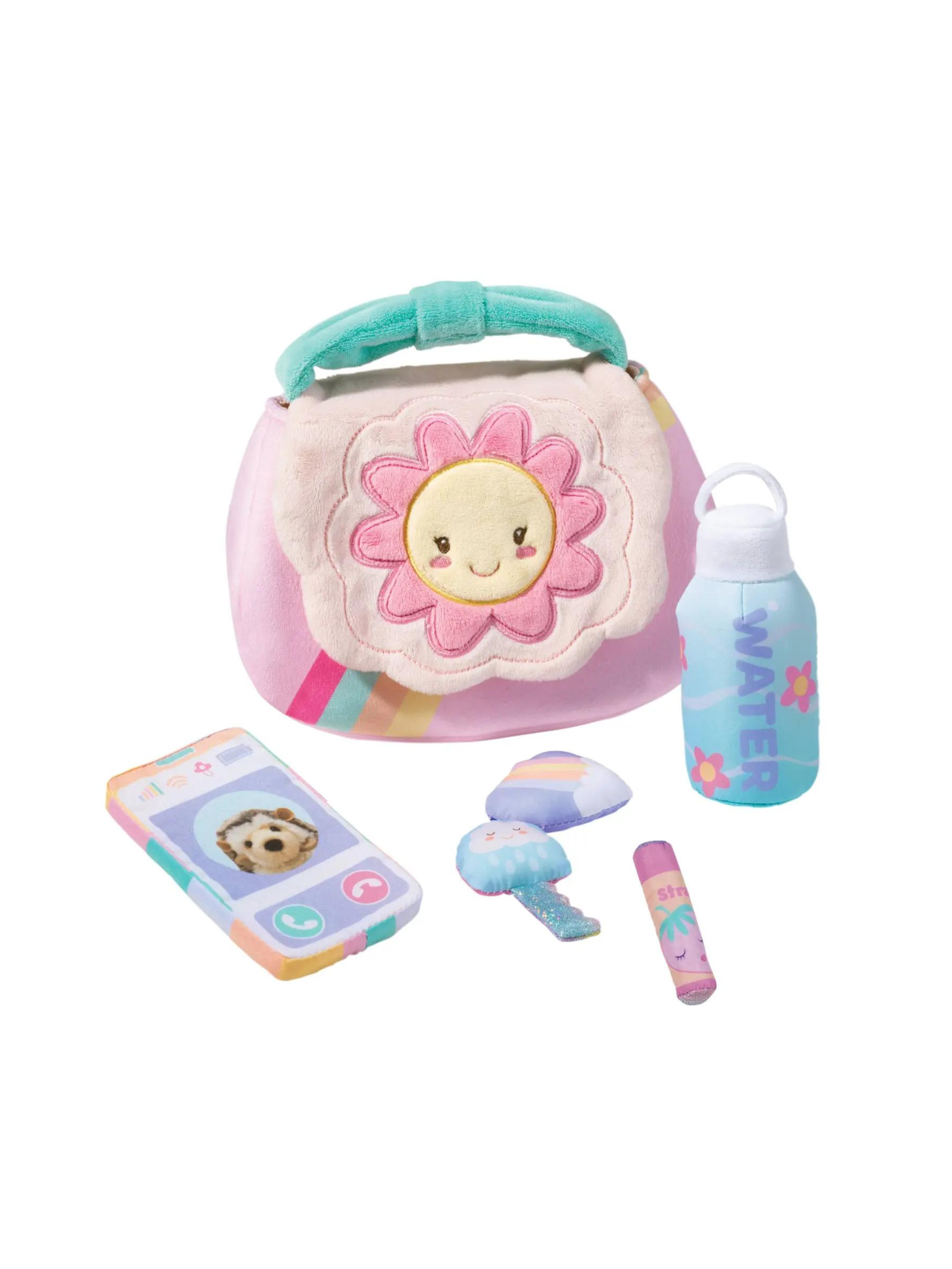 Let your little one take on the world of the grown ups with our engaging My First Purse set! This whimsical handbag and its assorted plush accessories are perfectly designed for small hands and big adventures! A visual caller ID reveals our plush Spunky the Hedgehog to be calling on the soft cell phone, while a cheerful applique flower peers out from the front flap of the purse with a warm smile