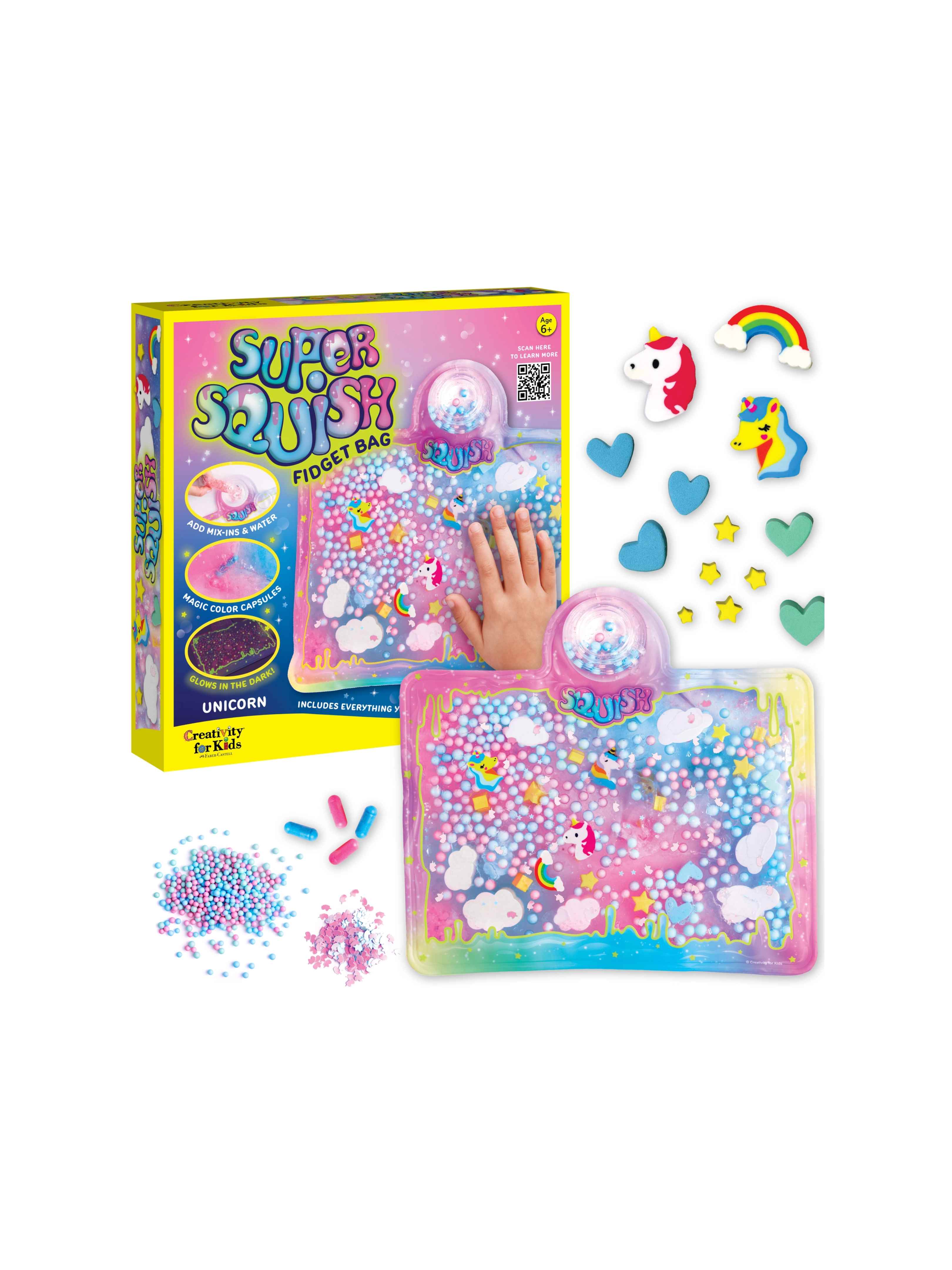 Your kit includes everything you need to mix and make your own super squishy fidget fun - just add water! Add water into the Super Squish bag and watch as the magic-mix capsules expand into a super-slimy, tie-die gel. Finish off your creation with cool confetti, glow in the dark accents, fidget mix-ins and more. Pop on the cap and get your fingers ready for extreme fidget fun