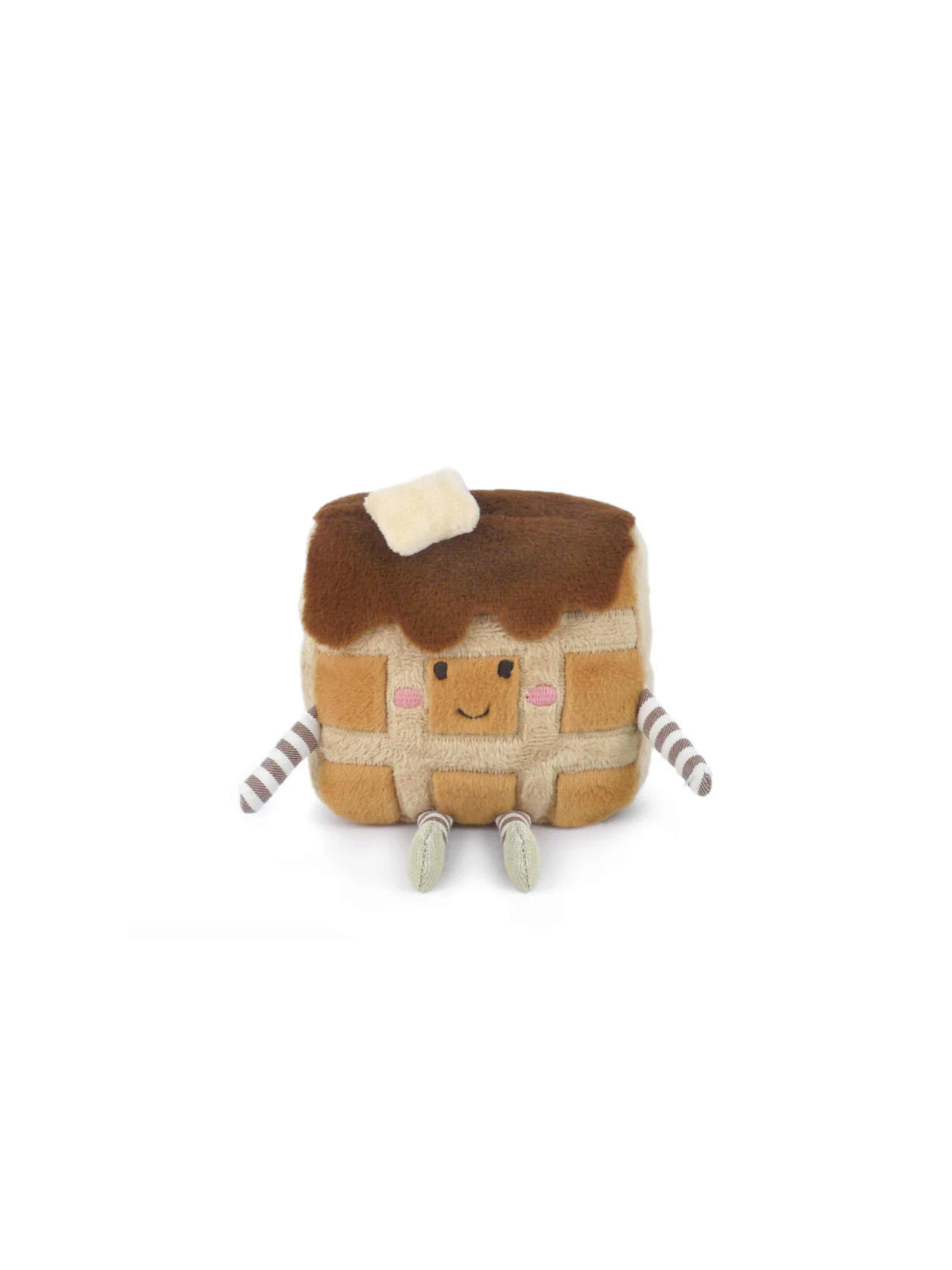 With her golden waffle squares, a dollop of soft "butter" and rich faux fur syrup dripping on top, she's a deliciously sweet treat. Her rosy cheeks, cheerful smile, and striped dangling legs and arms add a playful touch, making her perfect for cuddling, decorating, or gifting.