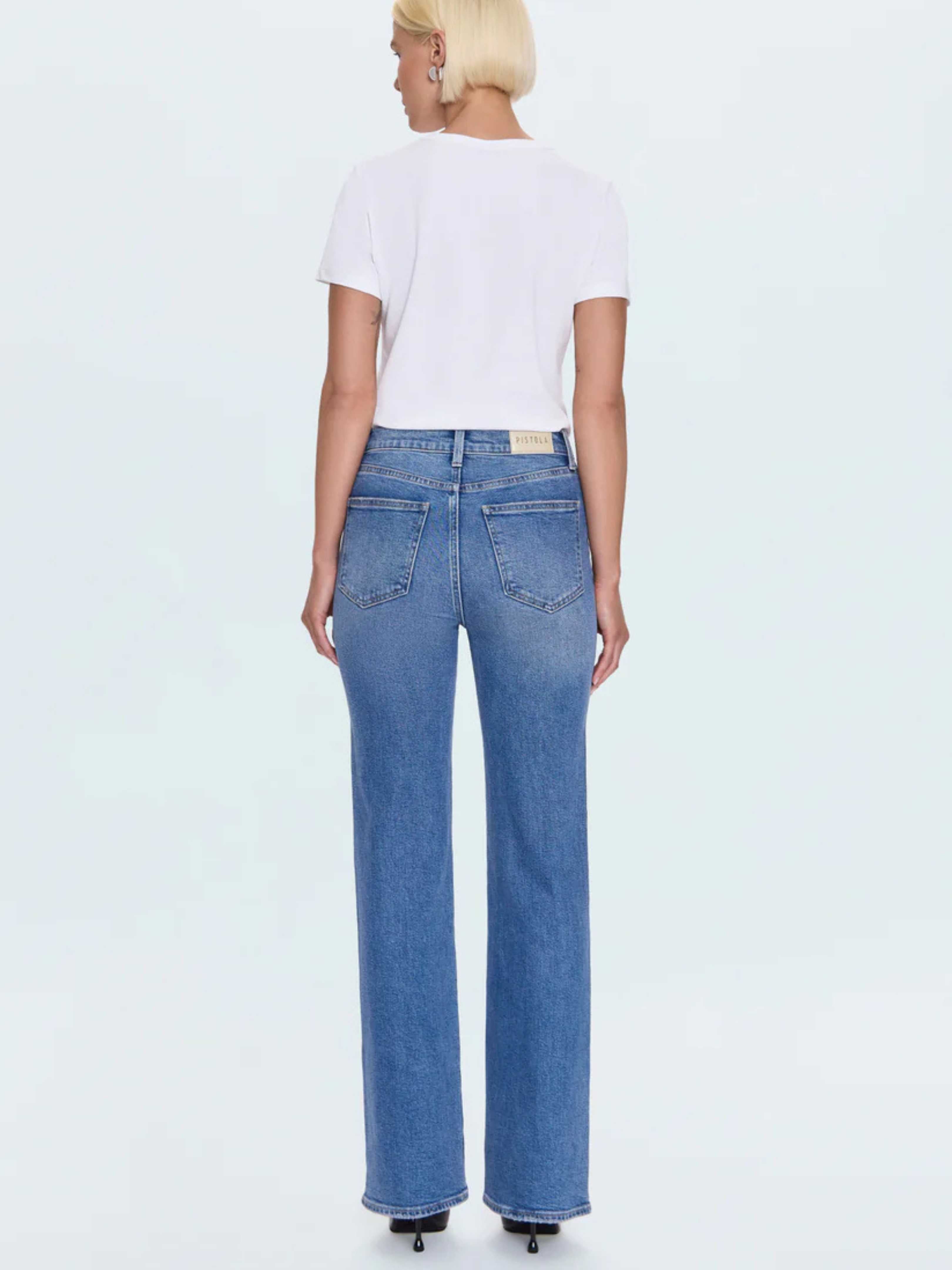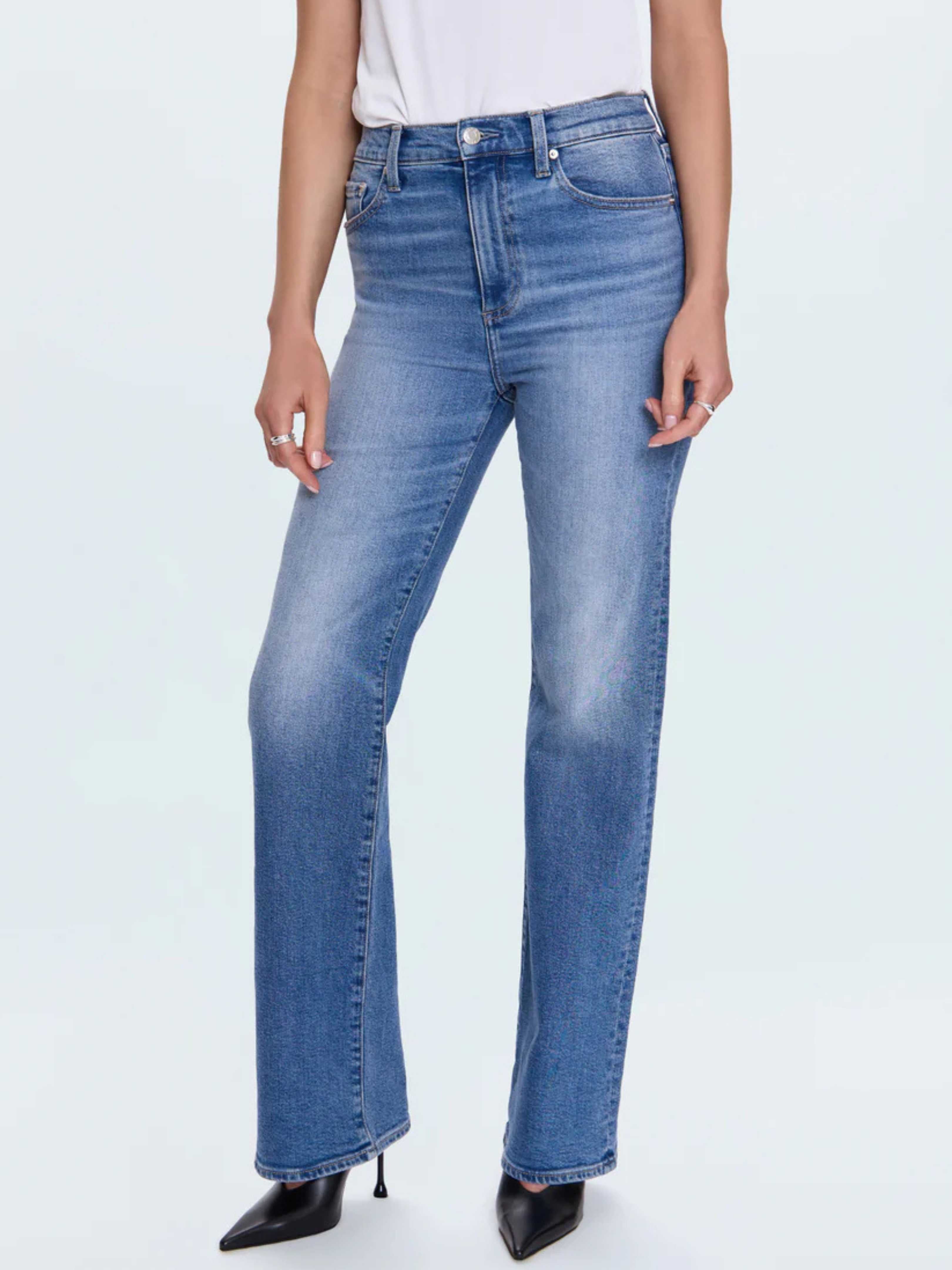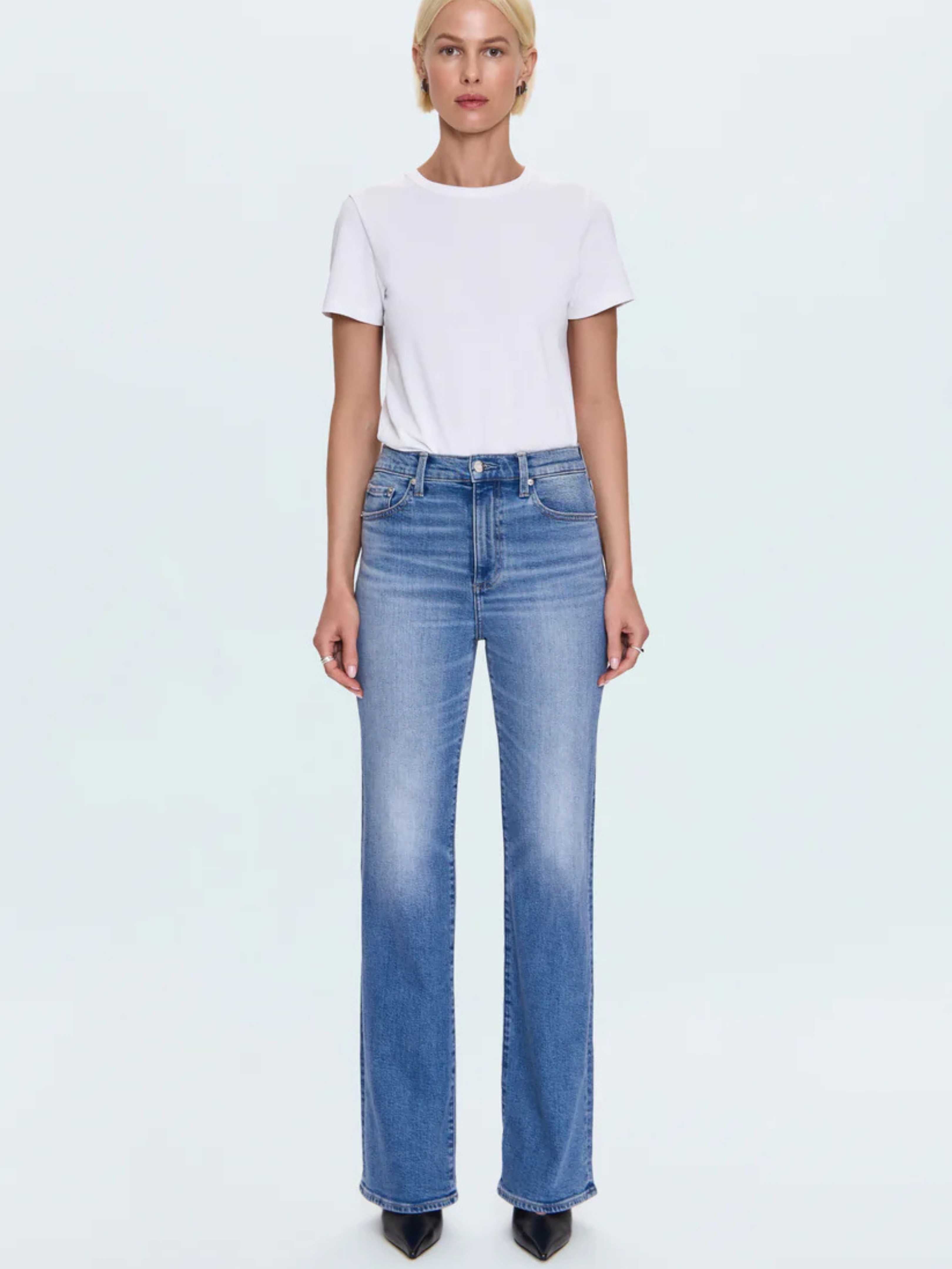 • The slim boot that flatters every frame, Evie sits high at the waist with a slim fit through the hips and thighs that opens to a subtle flare, creating long, balanced lines. The full-length 33" inseam elongates the leg for a flattering finish. Crafted from comfort stretch denim in Illusion, a medium indigo wash with soft fading and whiskering that feels effortlessly lived-in.