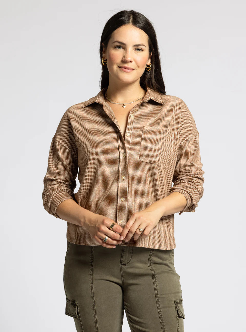 An easy take on the classic button up featured in a brushed knit fabrication, micro grid print and single chest pocket detail.