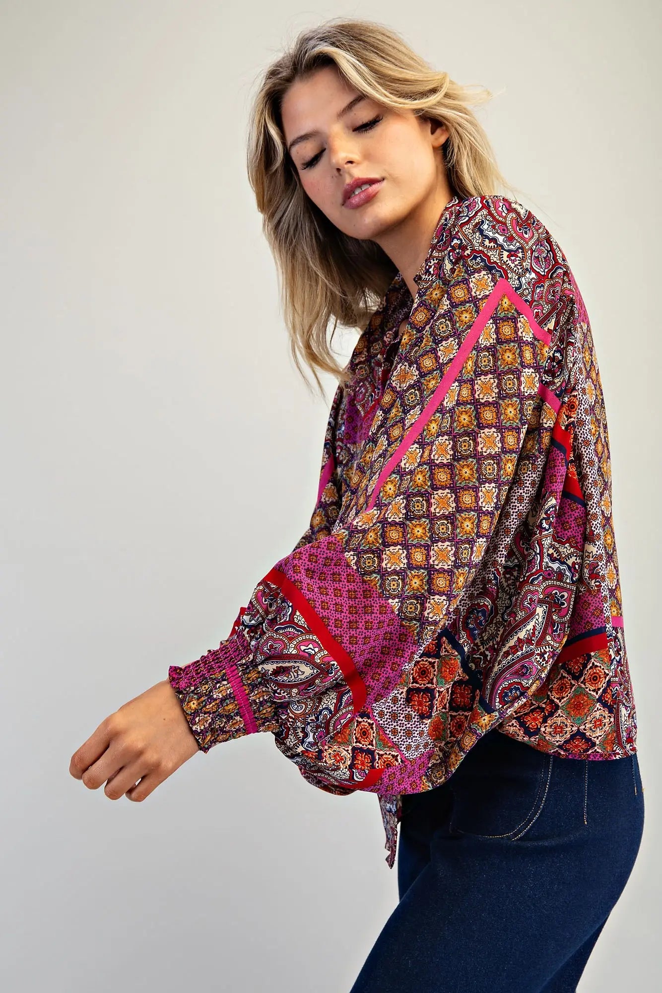 Boho collared long sleeve top with smocked cuffs, button front closure, and puff sleeves. Flowy top that's easy to wear!