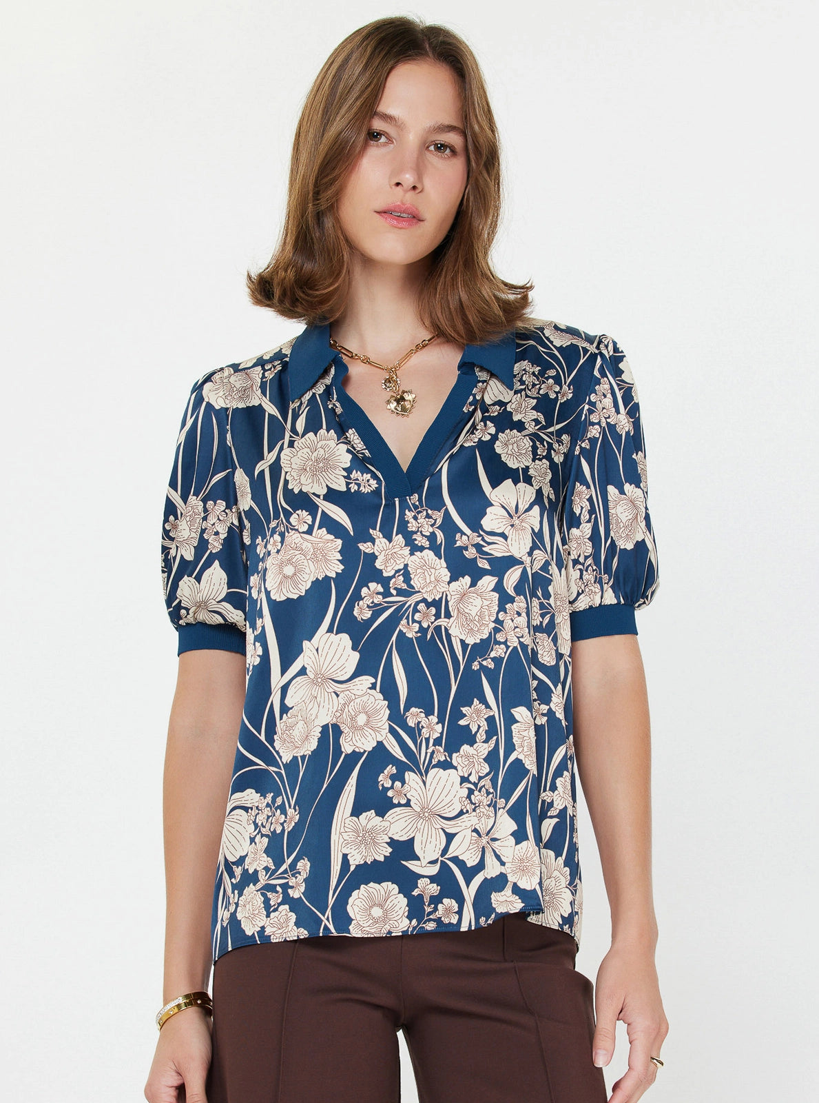 -All-over floral digital print -Split V-neckline -Short puff sleeves