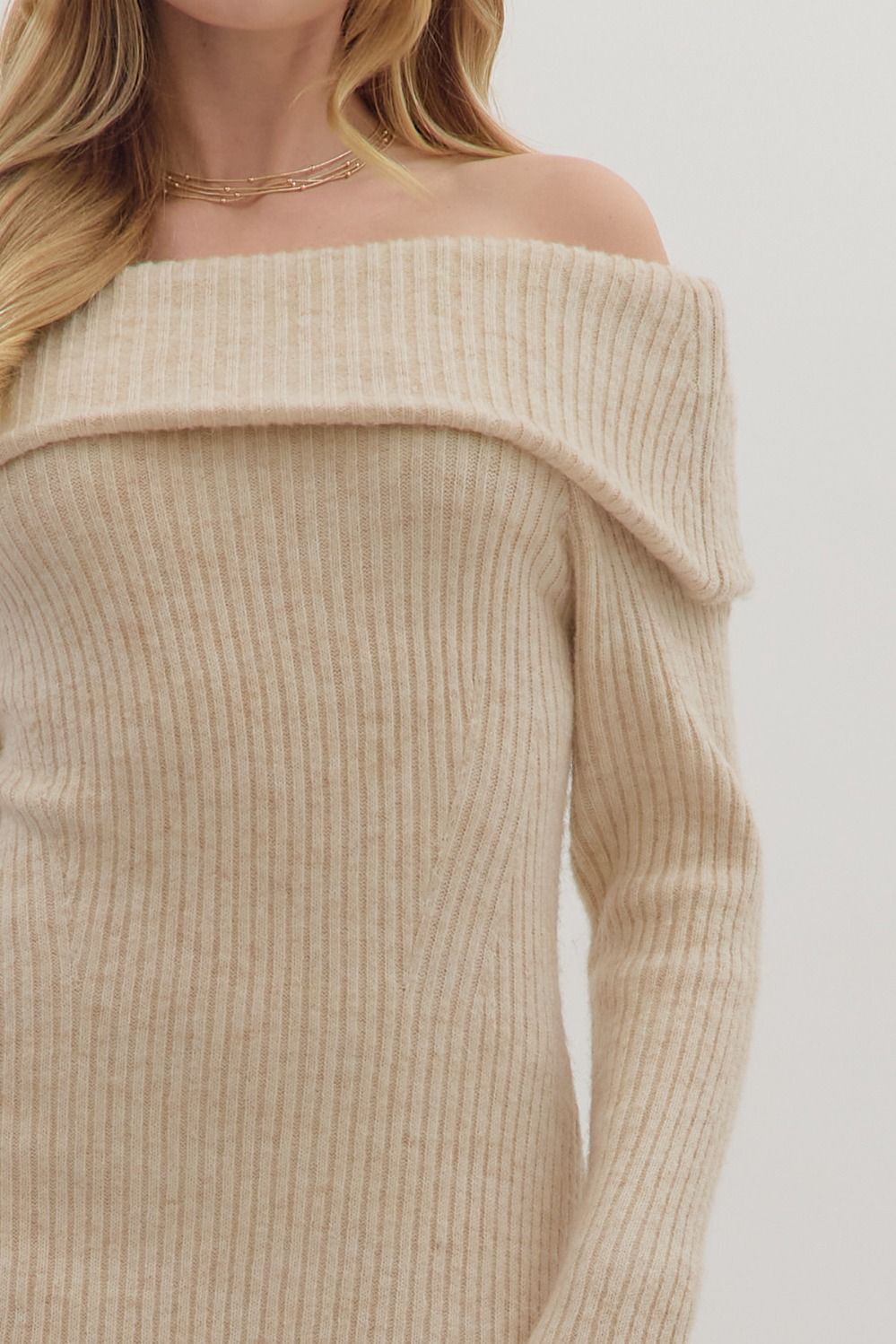• Solid long sleeve off-shoulder ribbed sweater knit midi dress featuring foldover neckline.