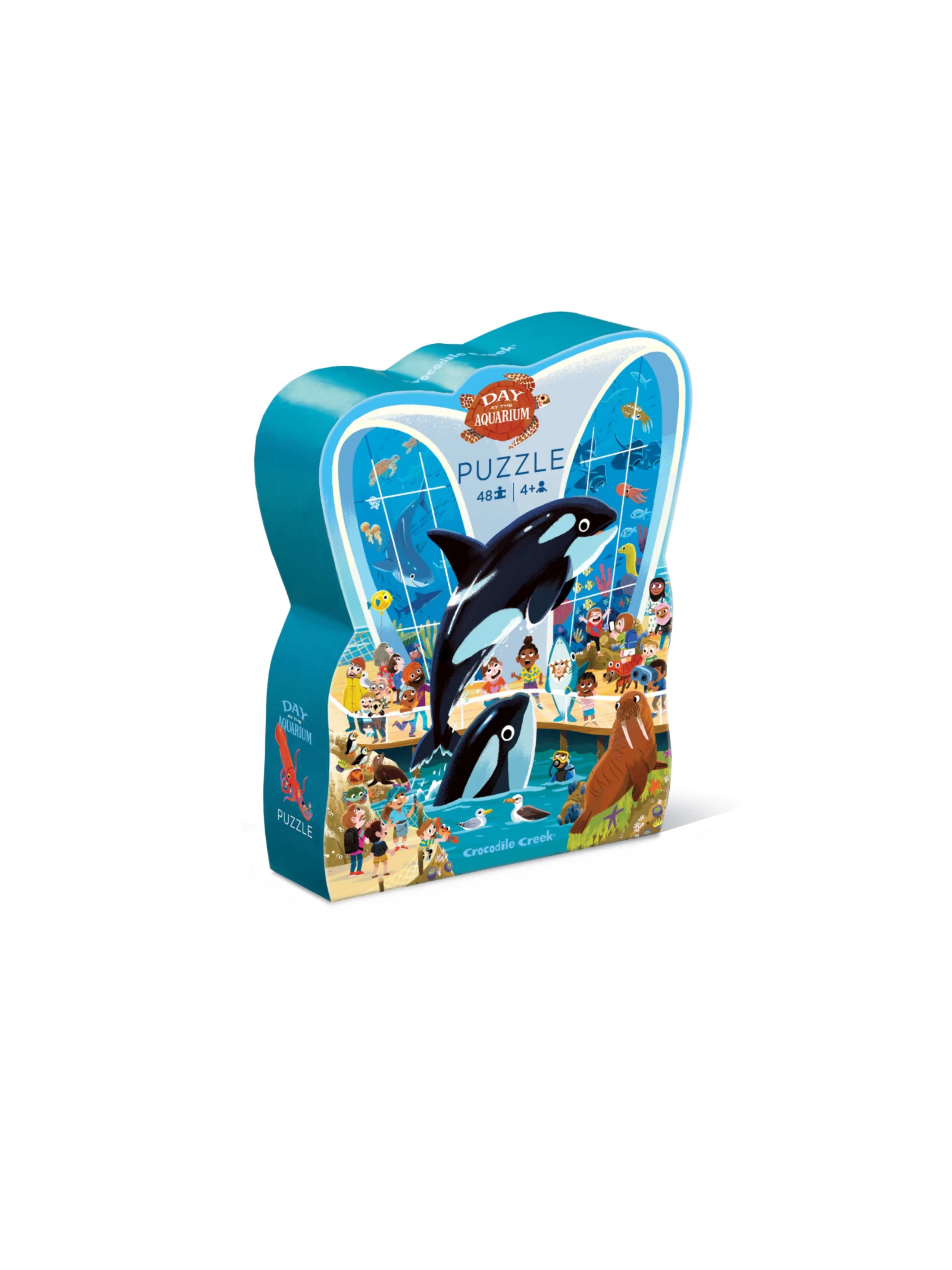 Kids Love to Visit the Aquarium! This Crocodile Creek Day at the Aquarium 48 piece puzzle will transport kids to the world of a fun, whimsical aquarium revisiting a favorite aquarium or remembering a wonderful outing with family, friends or classmates! Walk into the great hall be awed by giant fish tanks, sharks, jellyfish and starfish as well as many other wonders of the watery world. This richly detailed 18” x 24” puzzle, features children and families from a variety of backgrounds and is not only interesting and informative but humorous too. Packaged in a uniquely aquarium shaped box, it is guaranteed to delight both kids and parents.