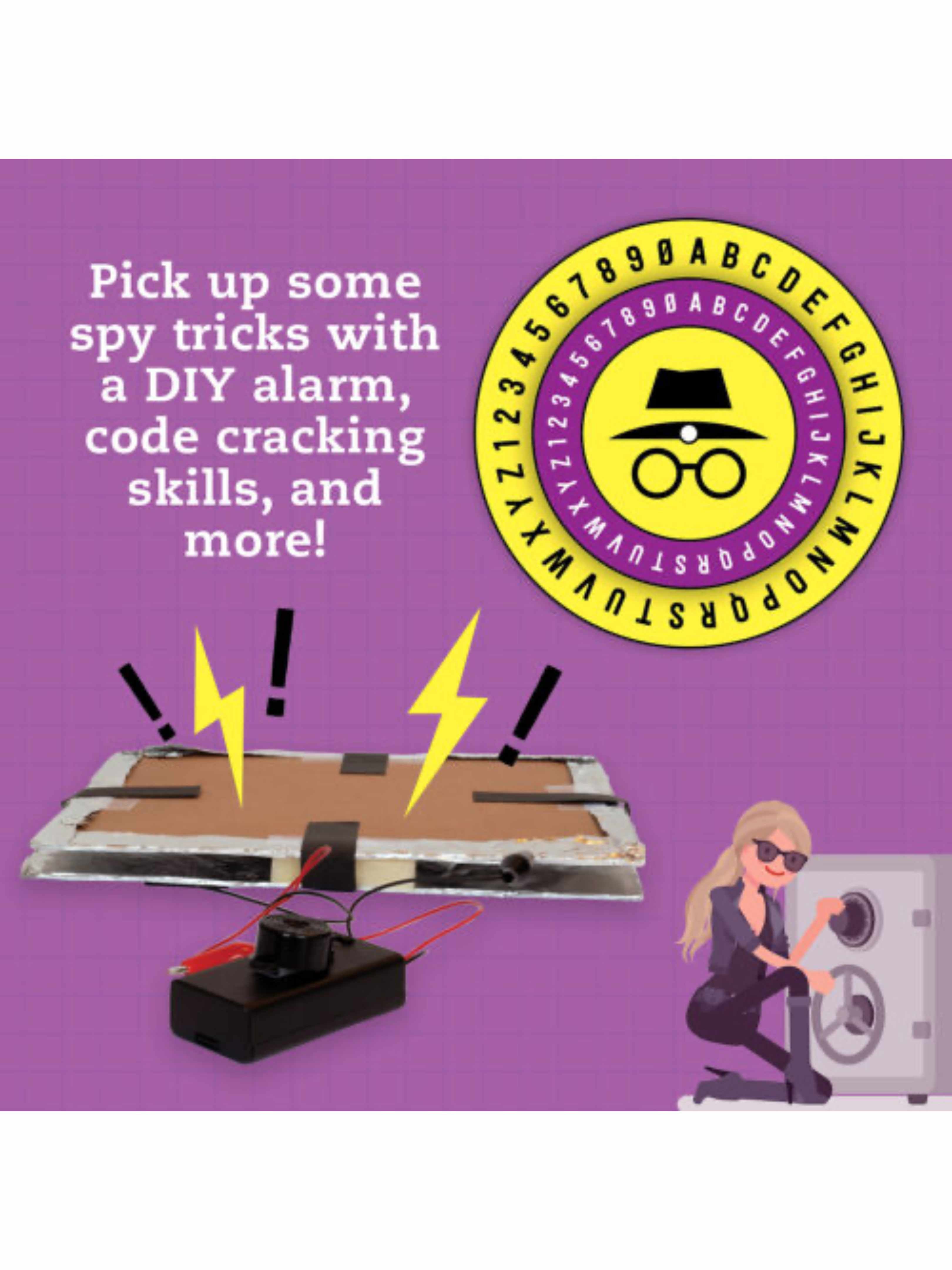 Assemble a double-security lock with a combination code and key to hide your most prized possessions. Then use the included buzzer and electronic components to build a really working door alarm or pressure plate to keep your valuables from prying eyes. With easy-to-find materials from home and our step-by-step instructions in the book, you'll find even more spy activities such as dusting for fingerprints, encrypting and decrypting codes, making diversion decoys, and more! Comes with: 6 plastic vault panels, clothespin, key, cord, buzzer, battery box.