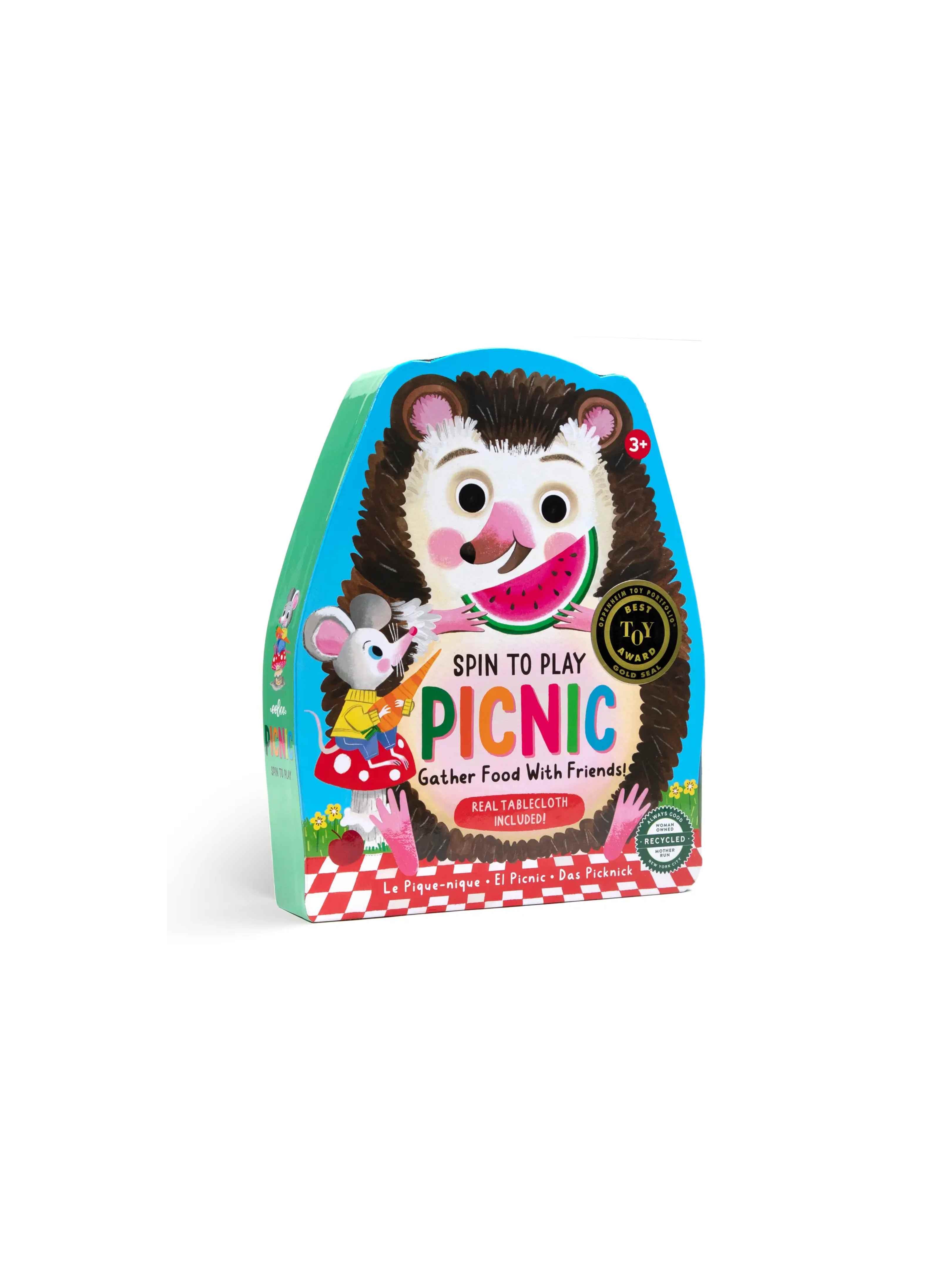Picnic Spinner Game, a great pre-school or family game. Easy instructions and fun to play. Spin for picnic gear and goodies - main course, fruit, vegetable, dessert and more. Be the first to fill your plate with something from each category to WIN. •Develops patience, social, and simple skill •Ages 3+ •Inside the Box: Spinner, 28 die-cut sturdy food, silverware and plate pieces, and fabric tablecloth •For 2-4 players •Play Time: 15-25 minutes
