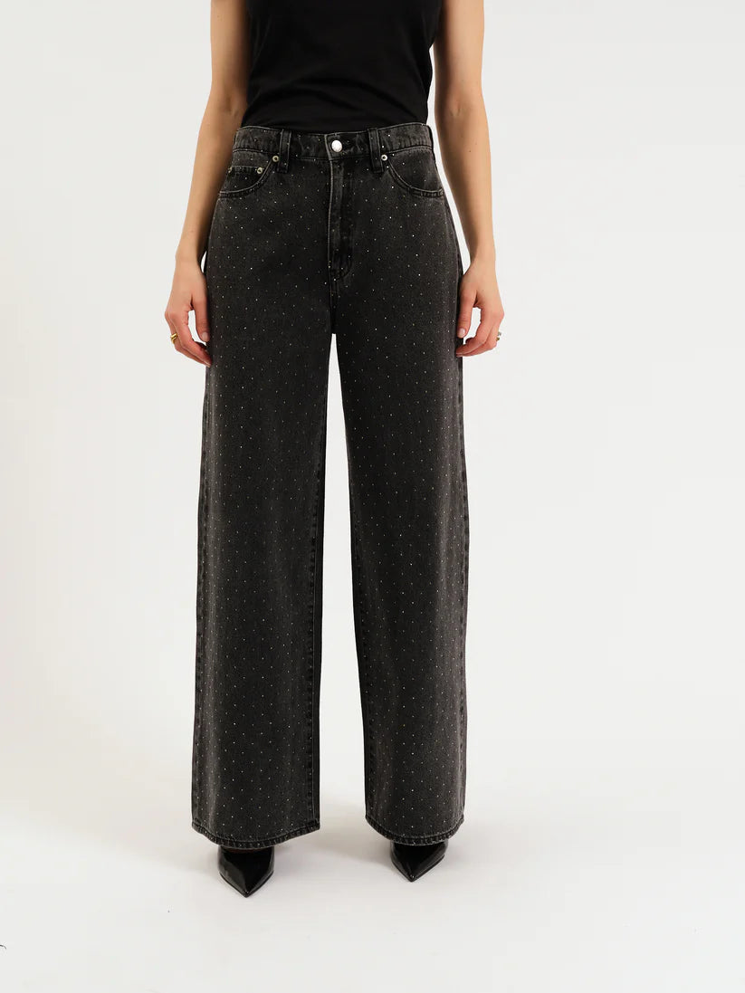 • These mid-rise palazzo jeans bring party-ready sparkle to your everyday wardrobe with festive studs scattered throughout the relaxed, wide-leg silhouette. In classic black with just enough shimmer, they're the perfect balance of comfortable and eye-catching—because who says you can't sparkle on a Tuesday?