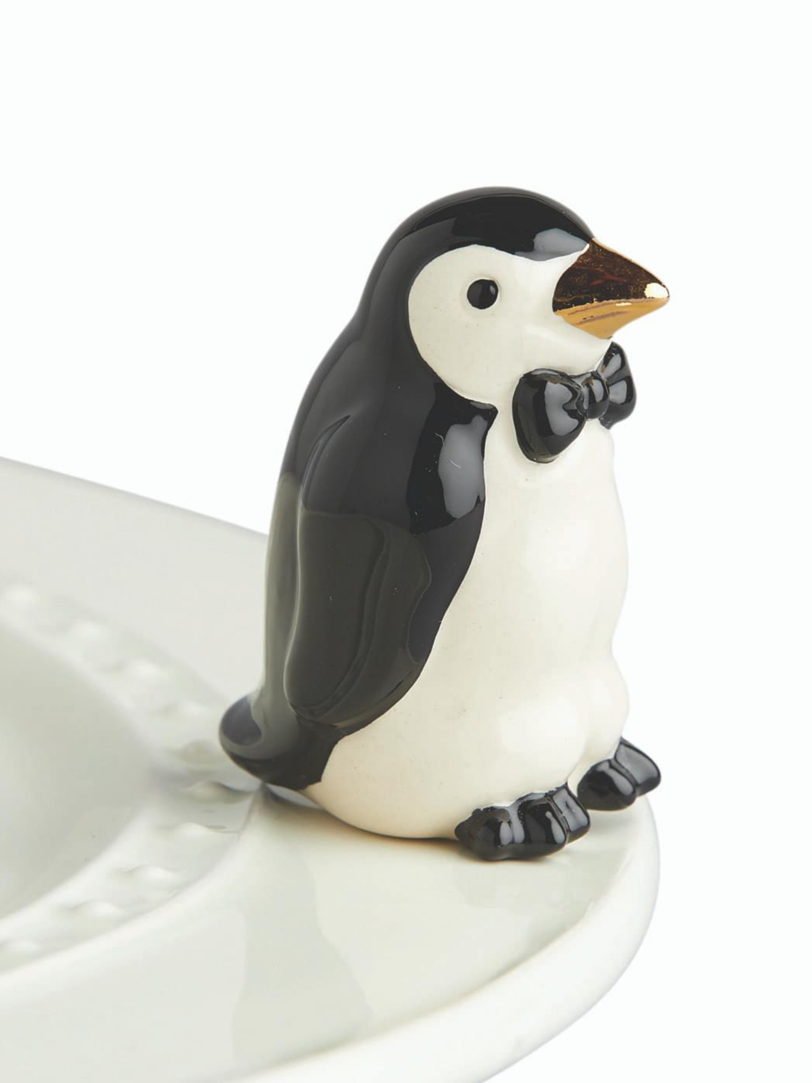 our little penguin mini features a gold beak and is just chillin’ with his tiny bow tie, too!
