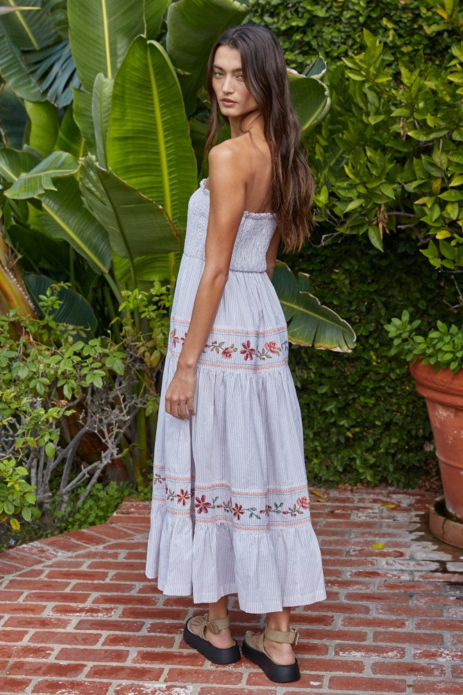 Smocked Cross Stitch Floral Detail Tube Midi Dress