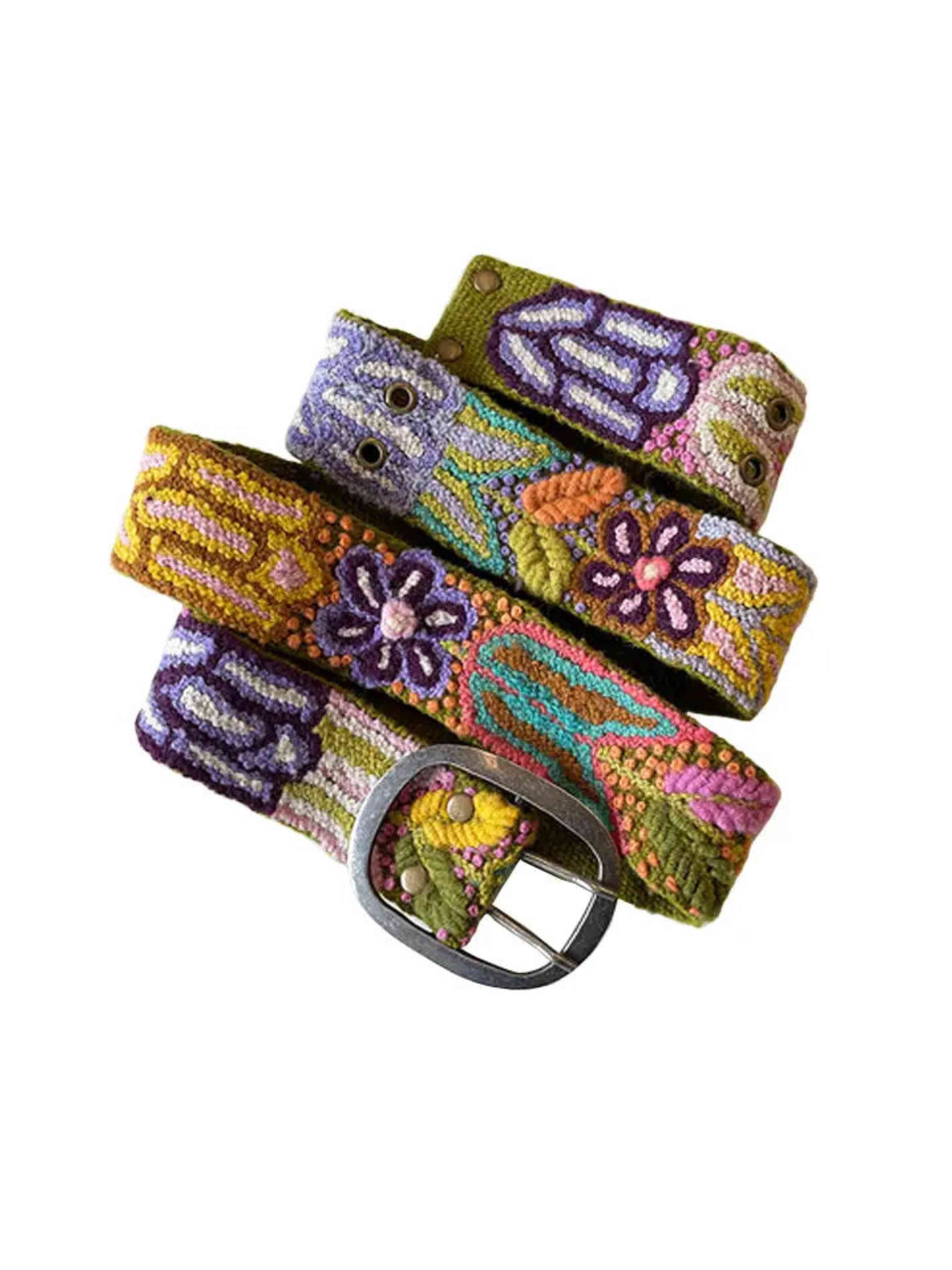 Gorgeous embroidered belt designed to be versatile with 5 sets of holes 2" apart so it can be worn at the hip or at the waist. You will love the slight stretch that conforms to the body after a few days of wear - just like your favorite pair of jeans!
