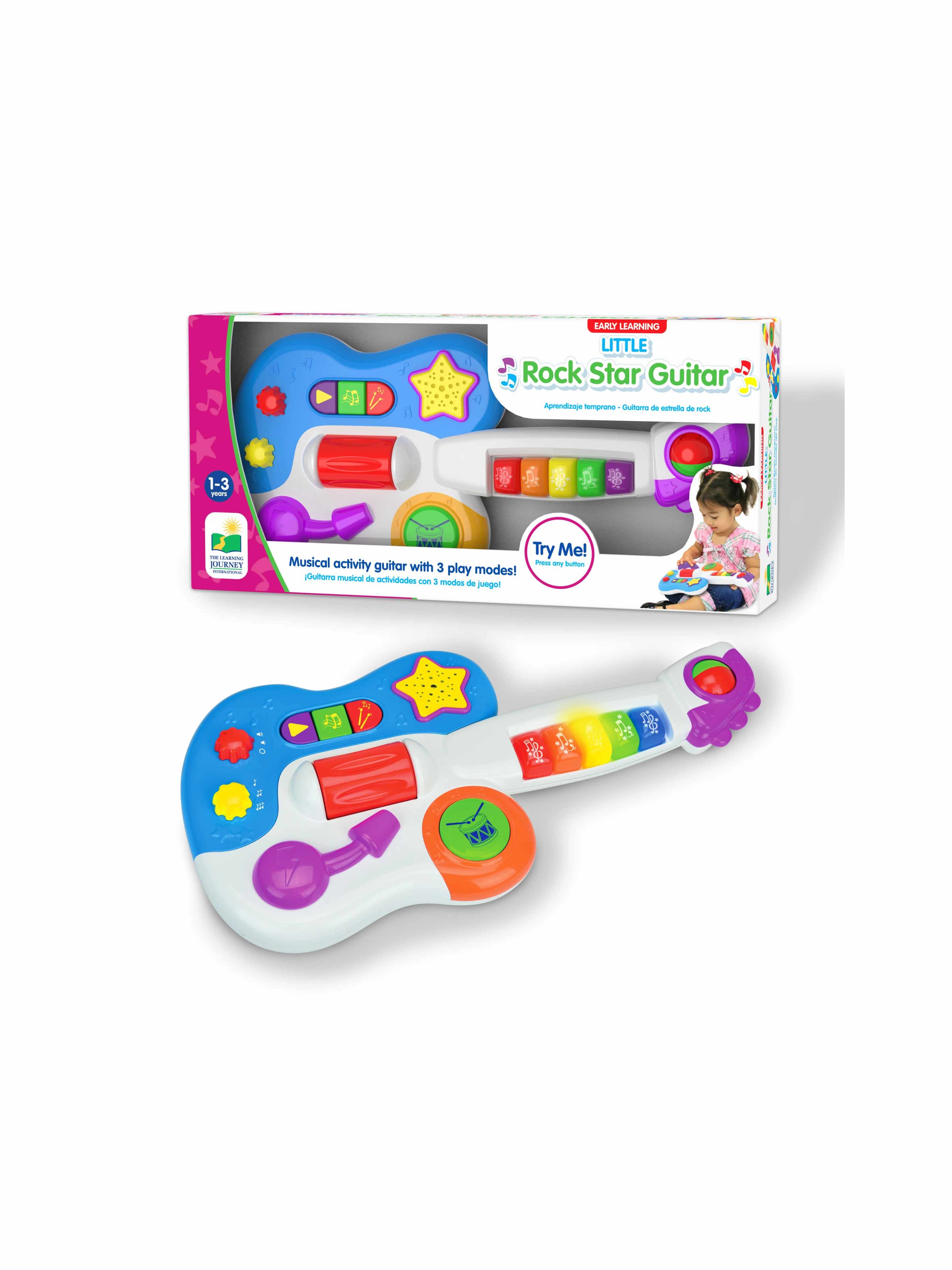 Your little ones will be "jazzed" up by this Little Rock Star Guitar. With multiple play modes and activates, musical talents will be inspired. Little Rock Star Guitar features three groups of music, three play modes, five light up musical buttons, whammy bar, drum button, and more.! The fun music and sound effects will have your little one rockin' for hours.