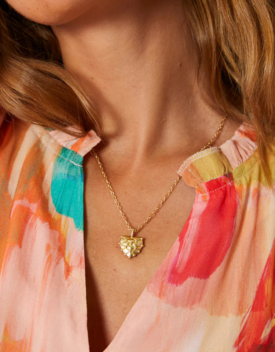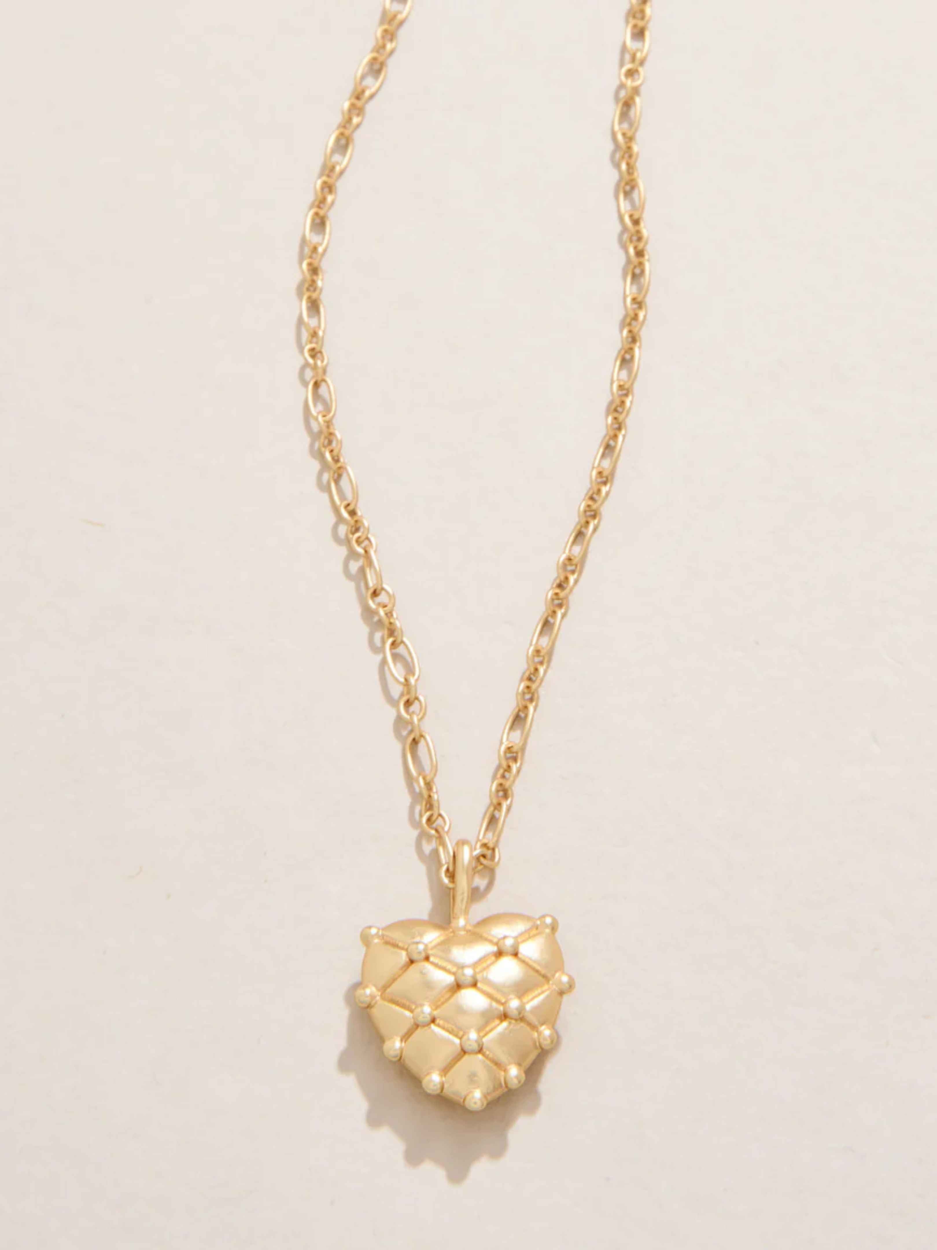 Made with the soft-hearted in mind, our Heart Pillow necklace is studded into the texture of a pillow within a heart shape in our signature lustrous 18kt matte gold plating.