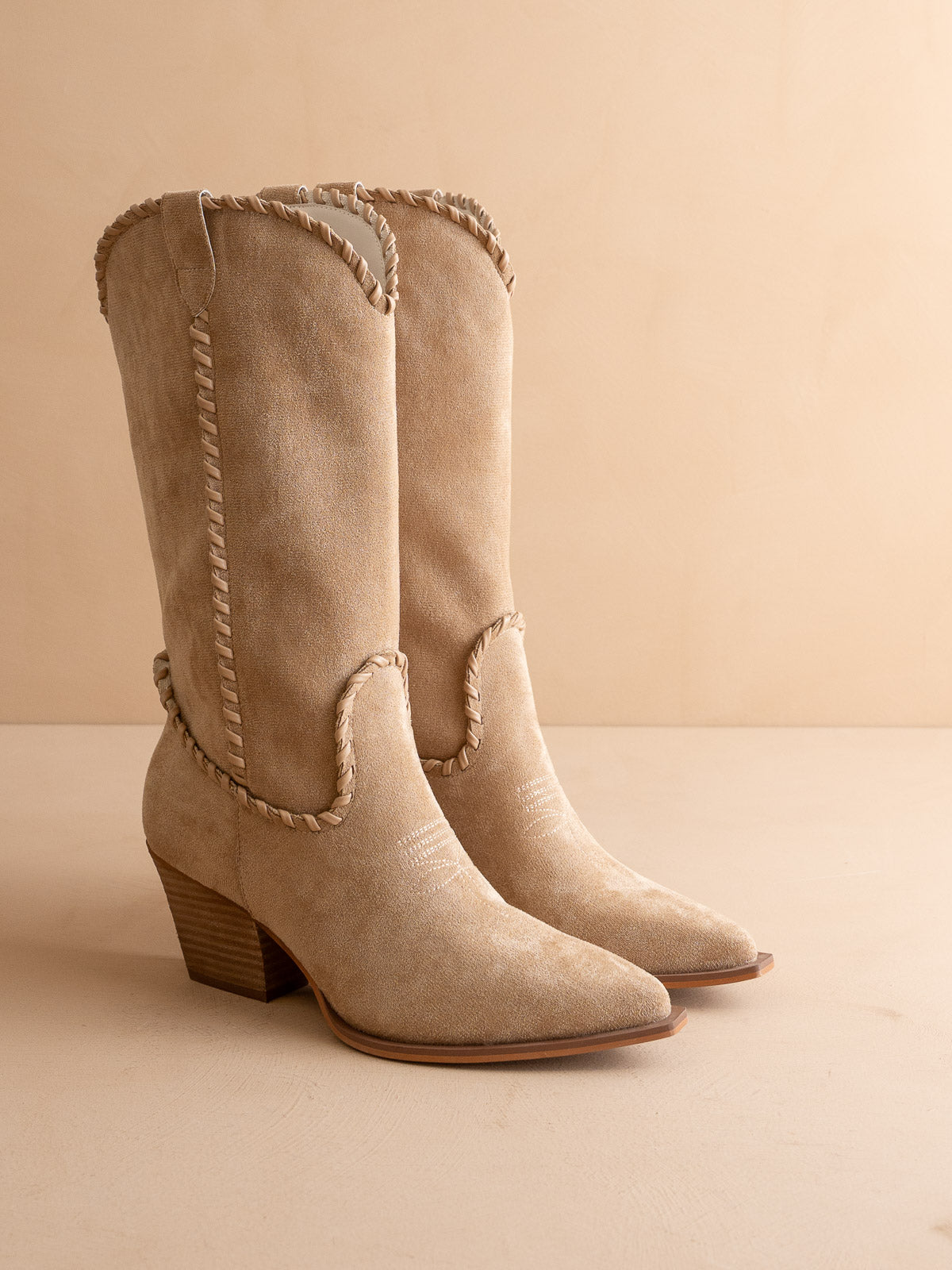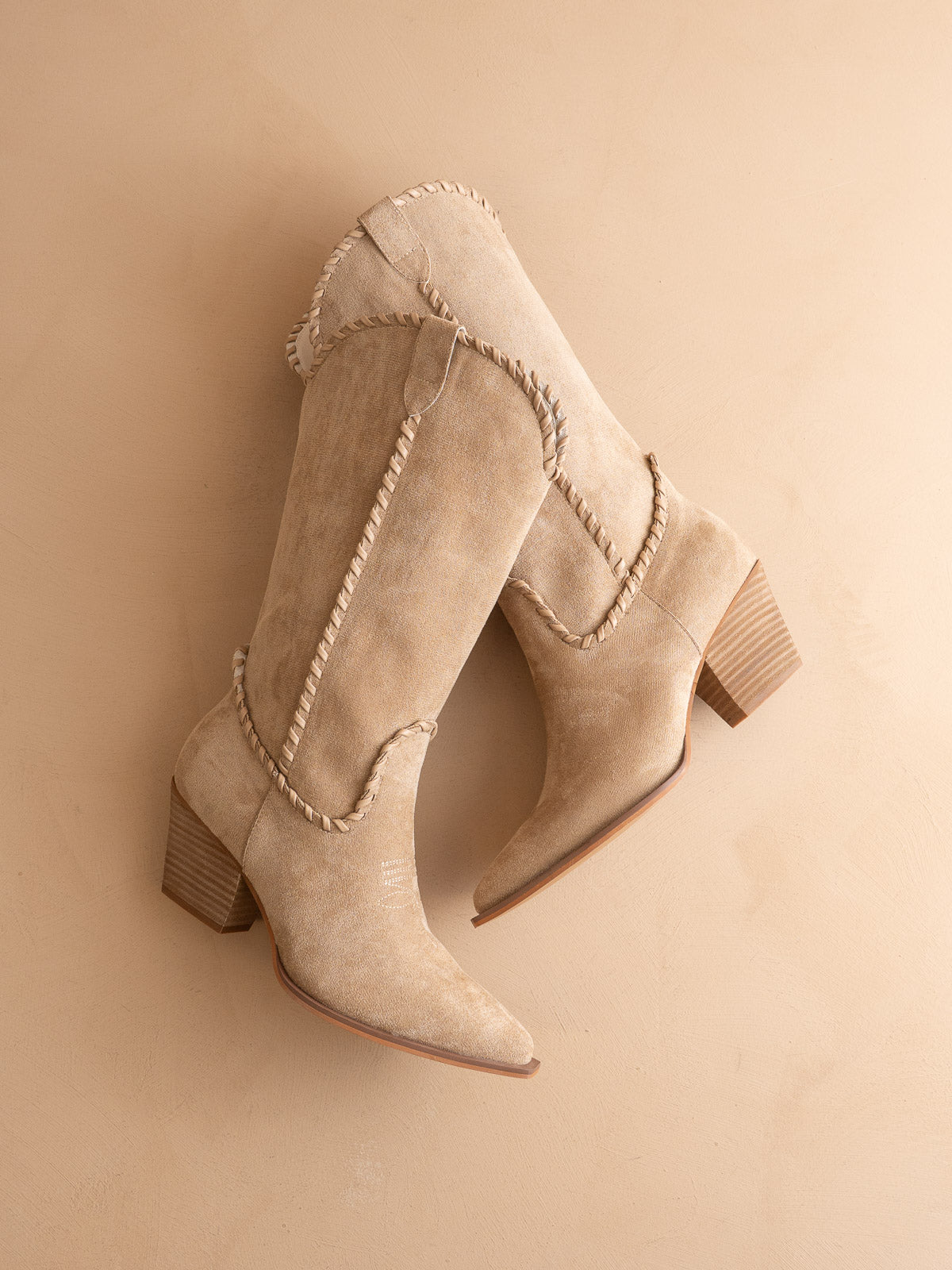The TILLEY stands out with bold whipstitch trim, a pointed toe, and a sculpted block heel — crafted in rich suede for that cool-girl, all-black moment